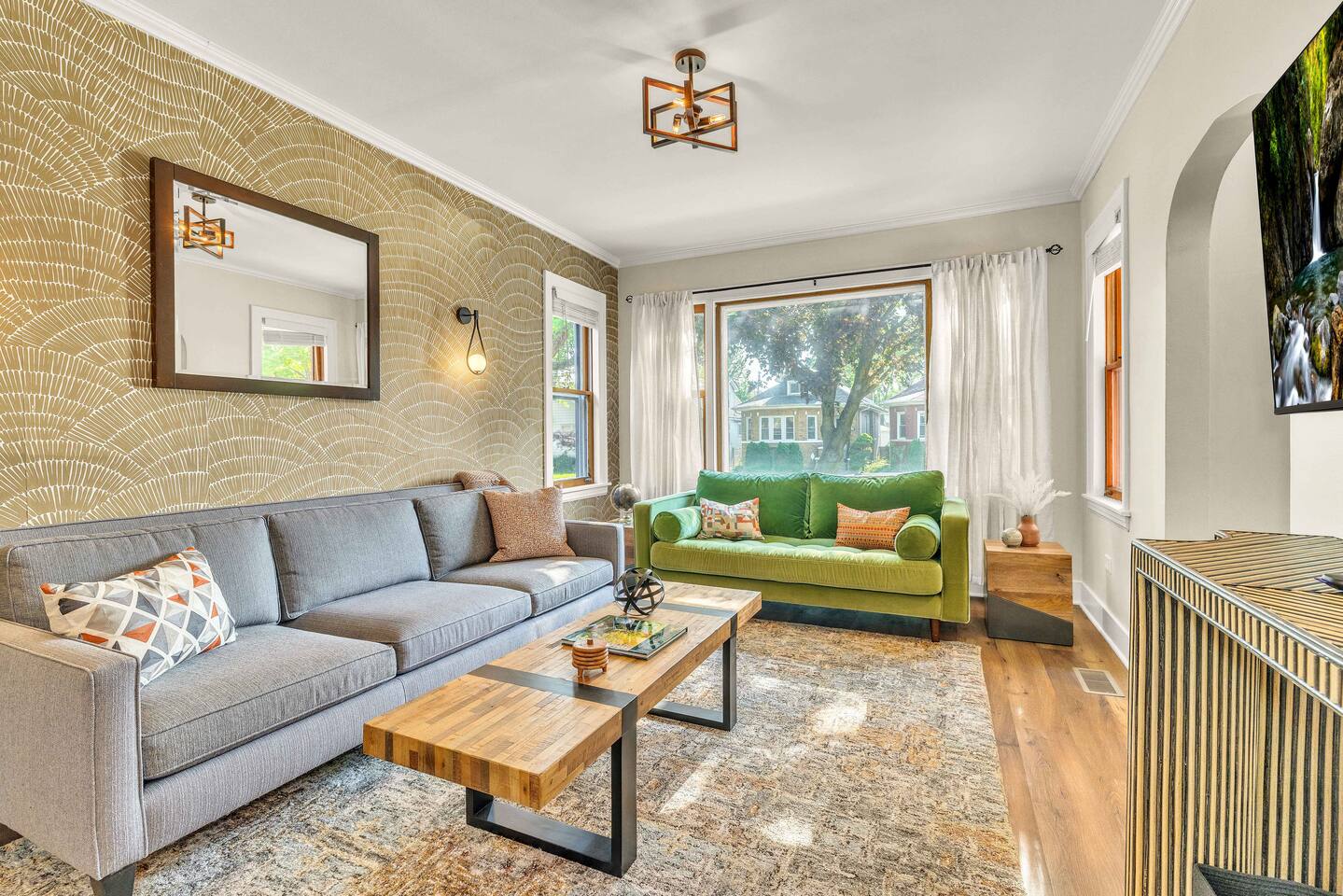 M A I N F L O O R ▪️Chic living room with bold light fixtures and 2 cozy sofas. ▪️Dining room with a round table for 8. ▪️Two spacious bedrooms (1 king, 1 queen) w/Additional quilts in closet ▪️Full bathroom with tub & shower. K I T C H E N + BREAKFAST ROOM + C O F F E E BAR You Bring the Recipes, We’ve Got the Rest! Fully stocked for family feasts, pancake mornings, and taco nights: ▪️Pots, pans, and bake ware galore ▪️Utensils, knives, and all the chopping essentials ▪️Dishes and silverware for 10 ▪️Kid-friendly cups & plates too! ▪️Mixing bowls, measuring gear, and handy gadgets ▪️Toaster, blender, microwave, oven & stove top ▪️Big fridge/freezer combo for all your goodies ▪️Dishwasher to save your sanity Coffee First, Questions Later: Your Daily Buzz Starts Here! This cheerful little corner delivers the goods: ▪️Regular & decaf coffee ▪️Whole beans + grinder for your fresh brew fix ▪️Pour-over setup for the coffee snob in your crew ▪️A rainbow of teas — black, green, herbal, and fruity ▪️Rich hot cocoa w/marshmallows for kid vibes ▪️Sugar, creamers, honey sticks & cute mugs ▪️Take in the garden view while you sip UPPER LEVEL - P R I M A R Y SUITE Your own private retreat: ▪️King bed ▪️Day bed reading nook ▪️En-suite bathroom ▪️Double closets ▪️Blackout curtains ▪️Additional quilt B A S E M E N T - R E T R E A T Multiple relaxation spaces including ▪️Sectional ▪️Love seat ▪️Leather chairs ▪️Cushioned stools ▪️A large bedroom with both a king and queen bed w/Additional quilts ▪️A quiet office nook. Game Zone ▪️Arcade console with dedicated TV ▪️Board games: Scrabble, Left-Right-Center, Jenga Blocks, checkers, chess ▪️6-in-1 game table that includes foosball, pool table, ping pong & more Music Area Relax in leather chairs while listening to the record player system that also plays CD's & cassettes. E X T E R I O R Built in bench and Adirondack chairs surround a fire pit. Play corn hole. THE NEIGHBORHOOD Located on a quiet street in Brookfield, IL, Crimson Morton offers the perfect blend of peaceful suburb and easy access to Chicago adventures. This charming suburb has the best of both worlds—tree-lined streets and direct train access to downtown. 🚶🏽♀️ Just a 4-minute walk to the Congress Park Metra station 🚆 Reach downtown Chicago in about 25 minutes by train (express) 🚗 5 minutes to the Brookfield Zoo and local forest preserves 🚗 Easy drive to Oak Park, Riverside, and La Grange for great dining and shopping. 15 minutes to Oak Brook Mall - recently named one of the best malls in the U.S. Family-friendly, walkable area with parks, coffee shops, and local gems nearby. Explore the famous Brookfield Zoo, grab coffee at a Loca Mocha Cafe, or enjoy nearby parks like Ryder Woods and Wolf Road Prairie. Visit the largest video arcade in the USA, Galloping Ghost, less than a mile away. This location is ideal for groups who want to explore the city and come home to a quiet, comfortable space each night. Whether you’re heading to a concert, museum, golf tournament, or just enjoying time with loved ones, you'll have a restful, well-located home base.
